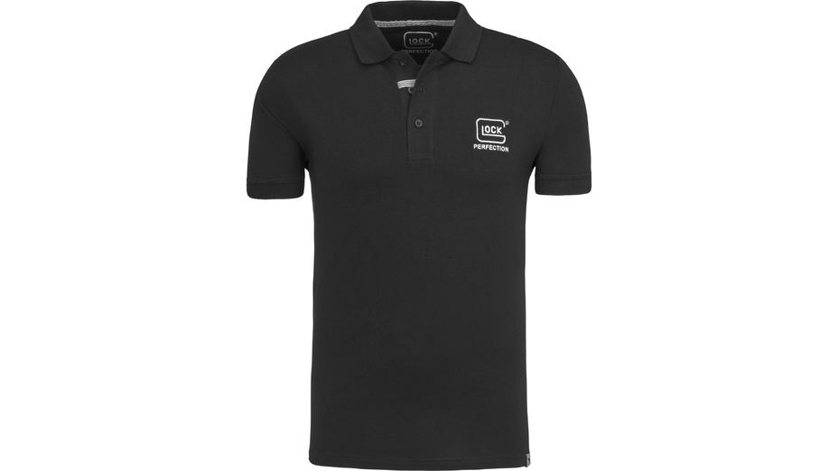 GLOCK Perfection Polo Shirt Herren in Schwarz (Größen S, M, L, XL, XXL, 3XL) aus 100% Pima-Baumwolle mit silbernem Logo-Stick, erhabenem Pistolen-Gummidruck am Rücken und gewebter Silberflagge.