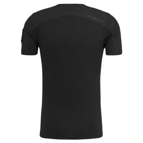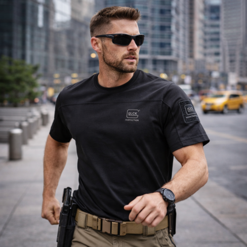 Das GLOCK Tactical T-Shirt in Schwarz verbindet einen sportlich-körpernahen Schnitt mit funktionalen Materialien: Der Torso ist als leichter, stretchfähiger Jersey mit hohem Baumwollanteil ausgeführt, während die Schulterpartie aus strapazierfähigem Ripstop-Gewebe besteht – praktisch für Outdoor, Training und „harte“ Nutzung.