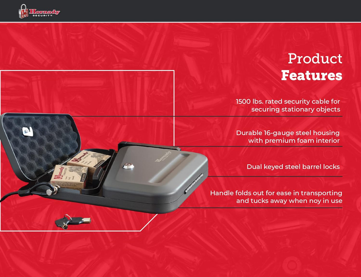 Das Gehäuse besteht aus robustem 16-Gauge-Stahl und widersteht Hebelversuchen und gewaltsamen Öffnungen. Für zusätzliche Sicherheit wird ein Stahlkabel mit 680 kg Zugkraft mitgeliefert, um die Box an stationären Objekten wie Fahrzeugsitzen oder Möbeln zu befestigen. Die hochwertige Schaumstoffeinlage schützt empfindliche Oberflächen und verhindert Verrutschen des Inhalts.