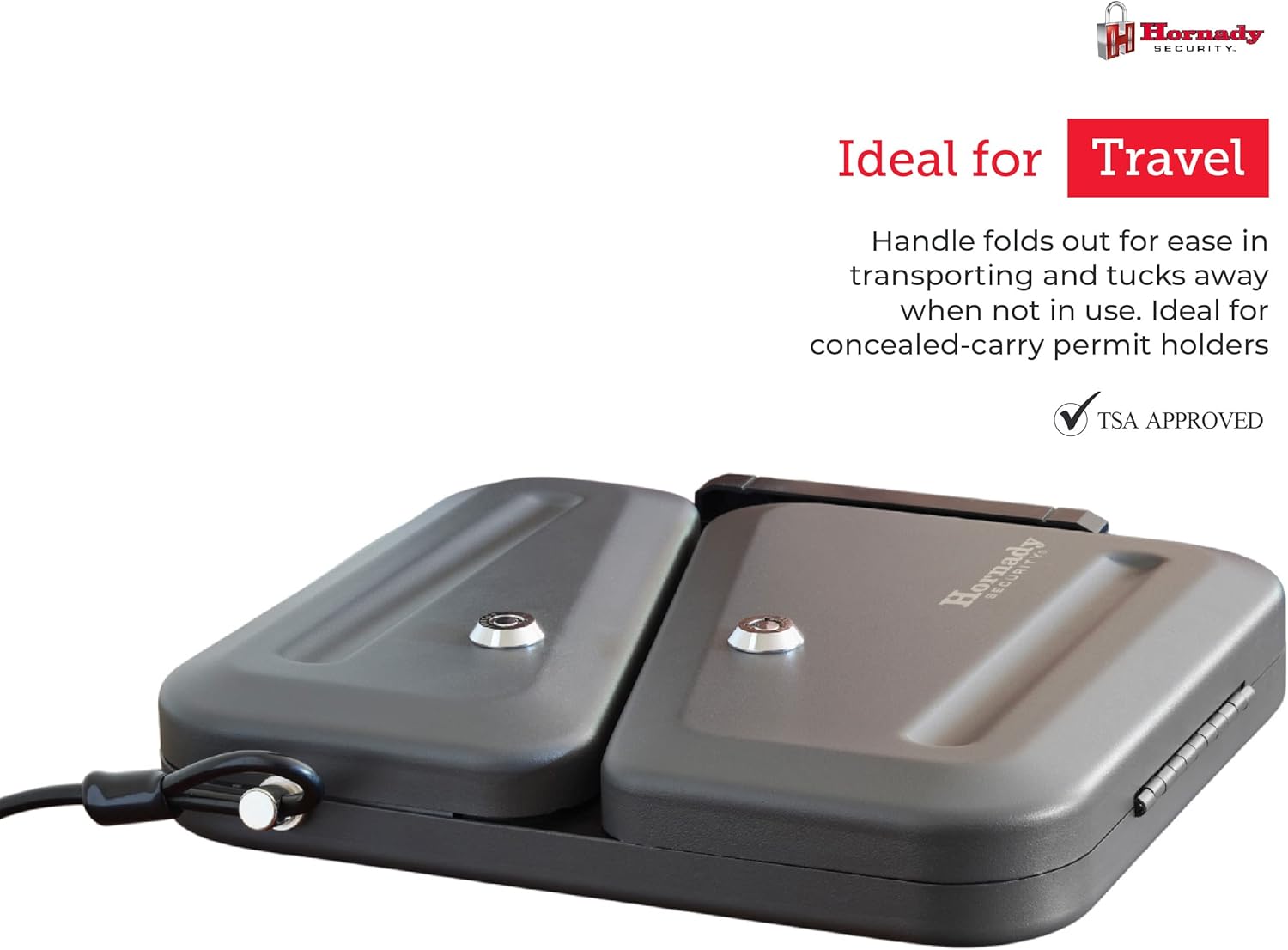 Dank des faltbaren Tragegriffs lässt sich die Box leicht transportieren und bei Nichtgebrauch platzsparend verstauen. Ideal für Reisen, verdecktes Führen und die sichere Aufbewahrung zu Hause oder im Fahrzeug. TSA-zertifiziert für Flugreisen.