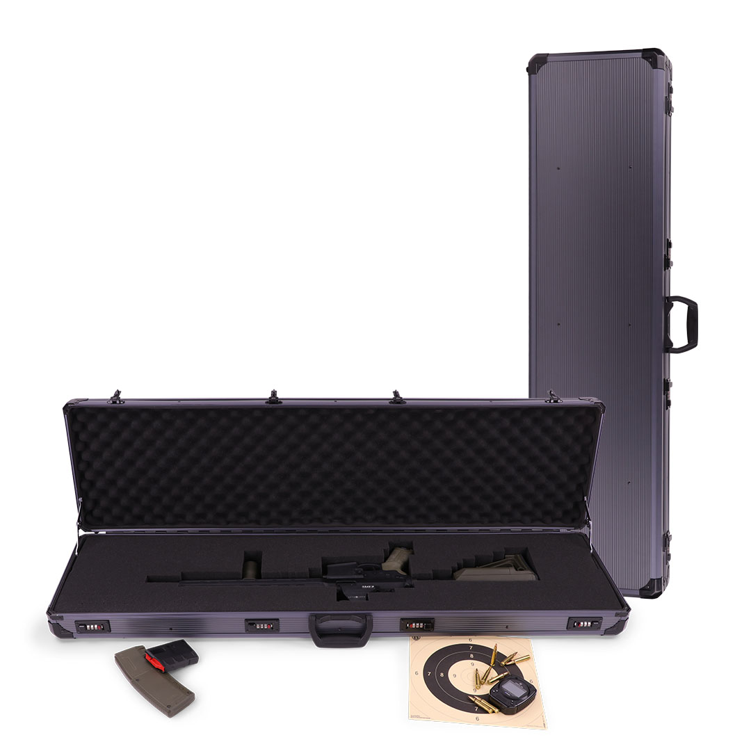 Der Gewehrkoffer ist für den sicheren Transport von 1 Langwaffe ausgelegt und kombiniert eine robuste Außenkonstruktion mit einer gepolsterten Innenausstattung. Laut Hersteller besteht der Koffer aus eloxiertem Aluminium und 6 mm starkem Holz und ist an den Ecken stoßabsorbierend ausgeführt.