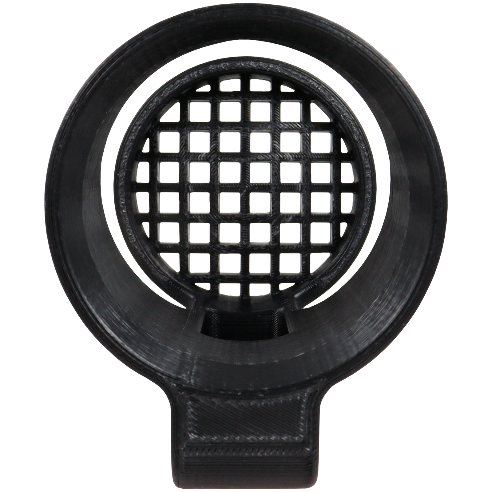 Die beiden integrierten Schlüssellöcher ermöglichen alternativ eine feste Wandmontage mit Schrauben. Durch das nach oben gewölbte Belüftungsgitter auf der Unterseite wird der Schalldämpfer optimal zentriert und belüftet – so kann Feuchtigkeit nach dem Gebrauch effektiv entweichen.