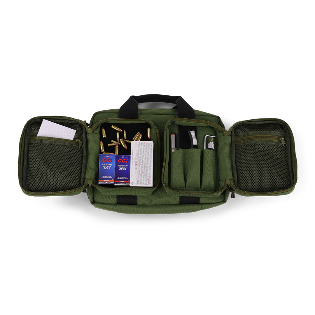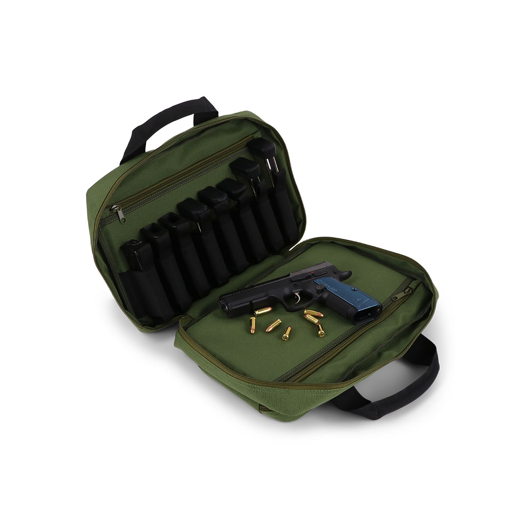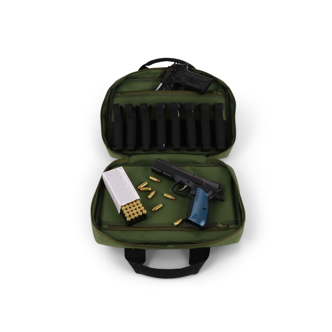 Diese Pistolentasche ist für den sicheren, organisierten Transport von bis zu 2 Kurzwaffen ausgelegt. Im Hauptfach liegen die Pistolen in zwei separat gepolsterten Fächern, dazu kommen 8 elastische Magazinhalter (laut Hersteller geeignet für Single- & Doublestack-Magazine).
