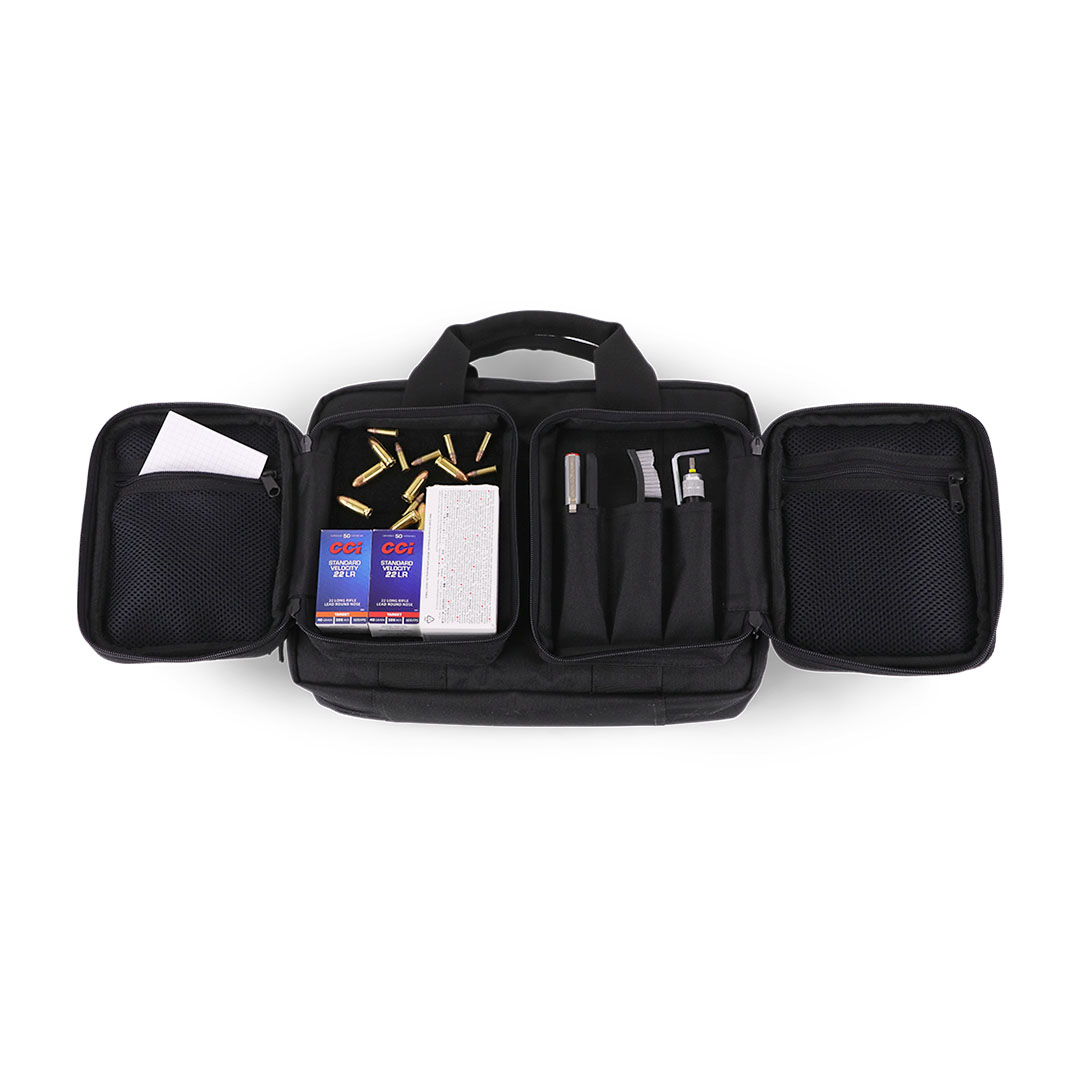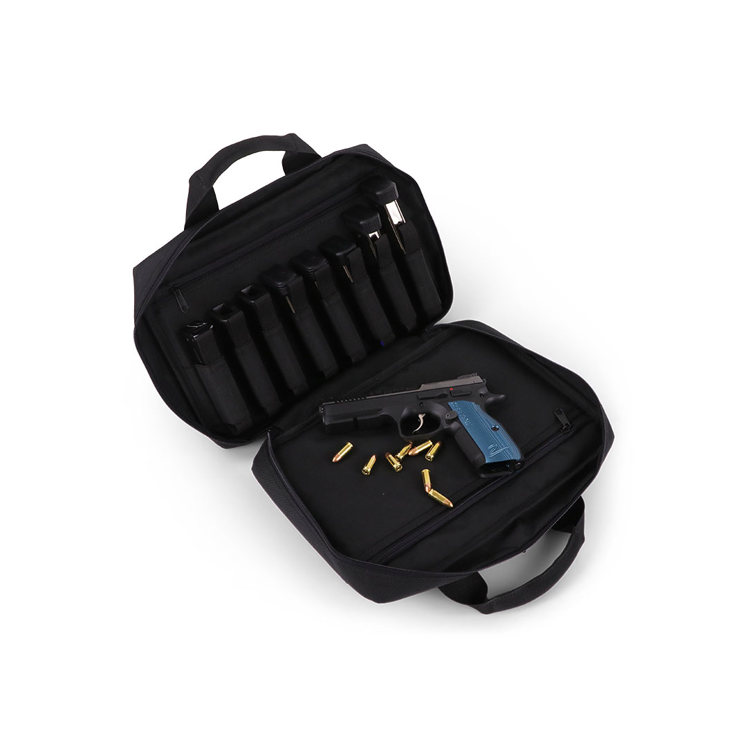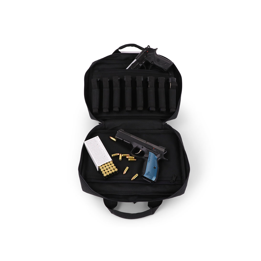 Diese Pistolentasche ist für den sicheren, organisierten Transport von bis zu 2 Kurzwaffen ausgelegt. Im Hauptfach liegen die Pistolen in zwei separat gepolsterten Fächern, dazu kommen 8 elastische Magazinhalter (laut Hersteller geeignet für Single- & Doublestack-Magazine).